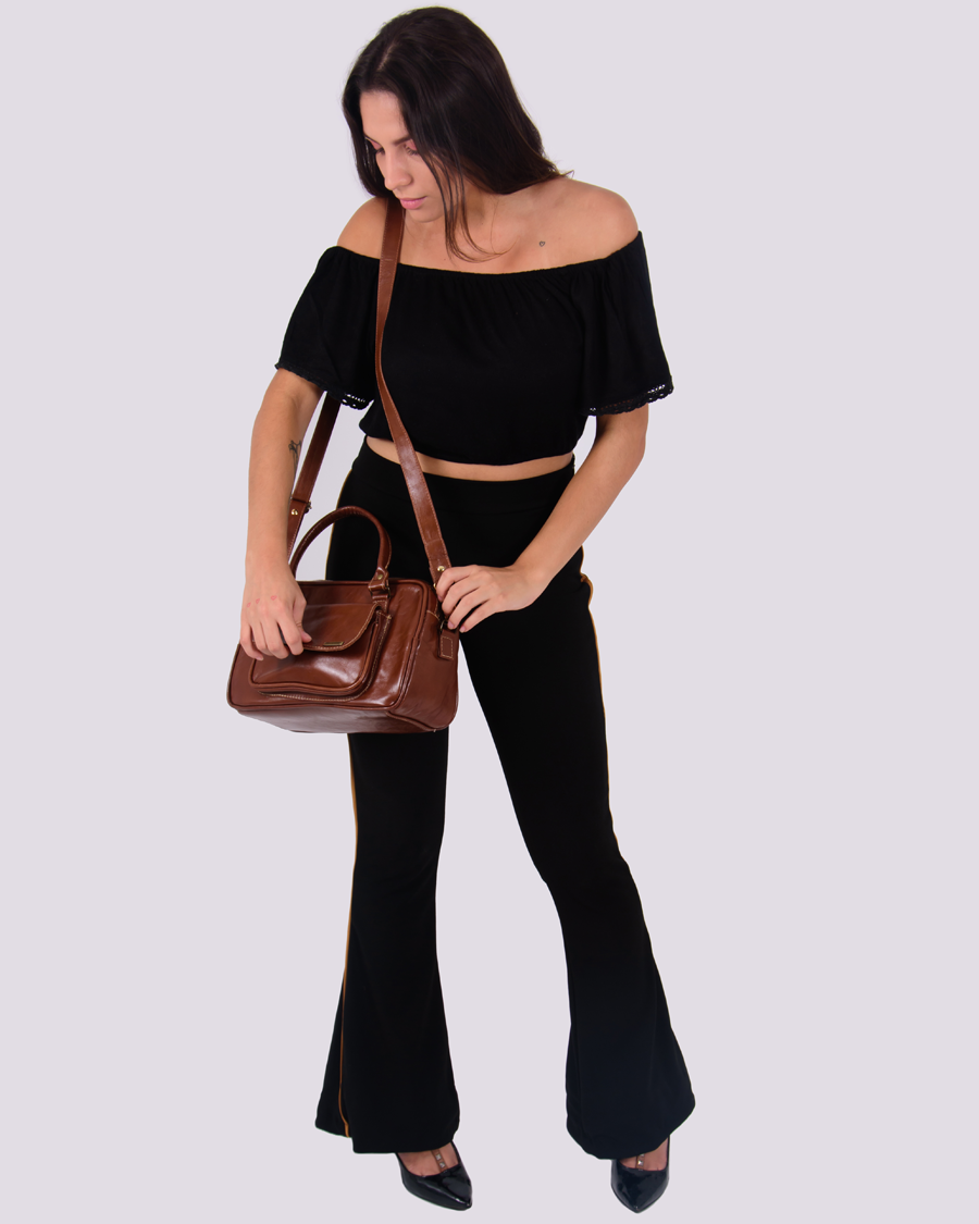 1 bolso na parte da frente fechado com botão 1 alça longa de conmprimento máximo de 1,40m